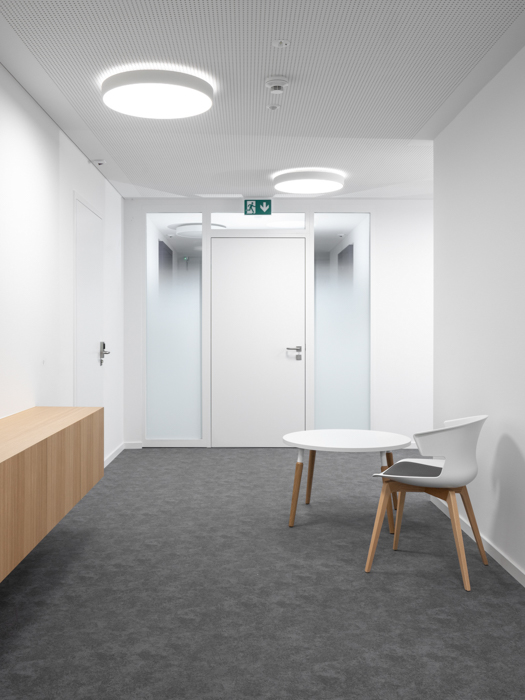 Les nouveaux locaux assument un caractère épuré qui sert de canevas pour multiples usages, lui conférant ainsi une flexibilité appréciée. Il reste calme et intemporel afin de permettre aux employés de s’approprier l’espace. Les murs peuvent en conséquence se remplir de témoins physiques du travail selon les besoins, tel que notes, documents et calendriers. Ces derniers peuvent être également recouverts par un rideau soigneusement encastré au plafond.